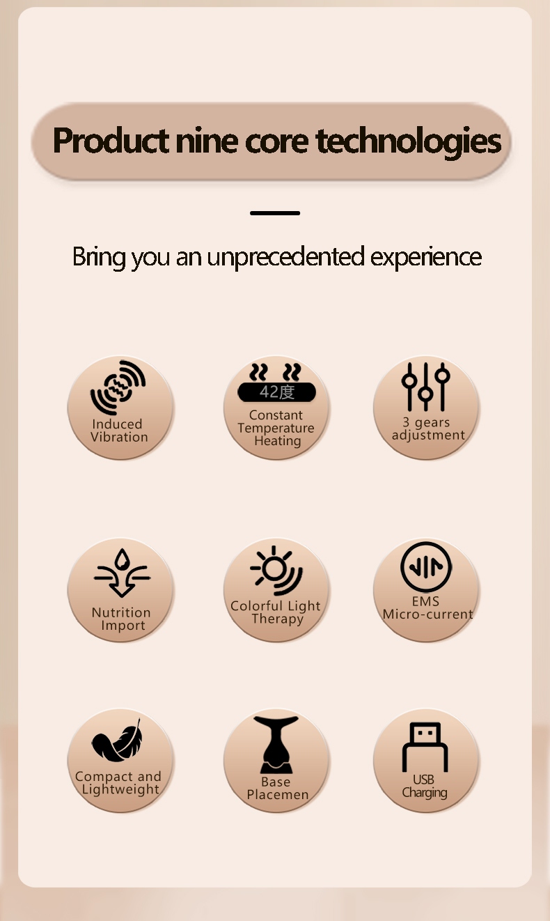 Warm moisture: 42℃ warm+red light therapy+ EMS( stronger)+ vibration , UV free, active collagen, vitality and rejuvenate skin
