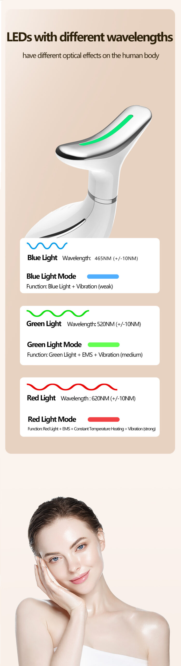 - White light 400nm+EMS (strong)+vibration: Comprehensively improve the tightnessof neck skin,deeply moisturize,effectively fade fine lines,and reshape elegant neck lines