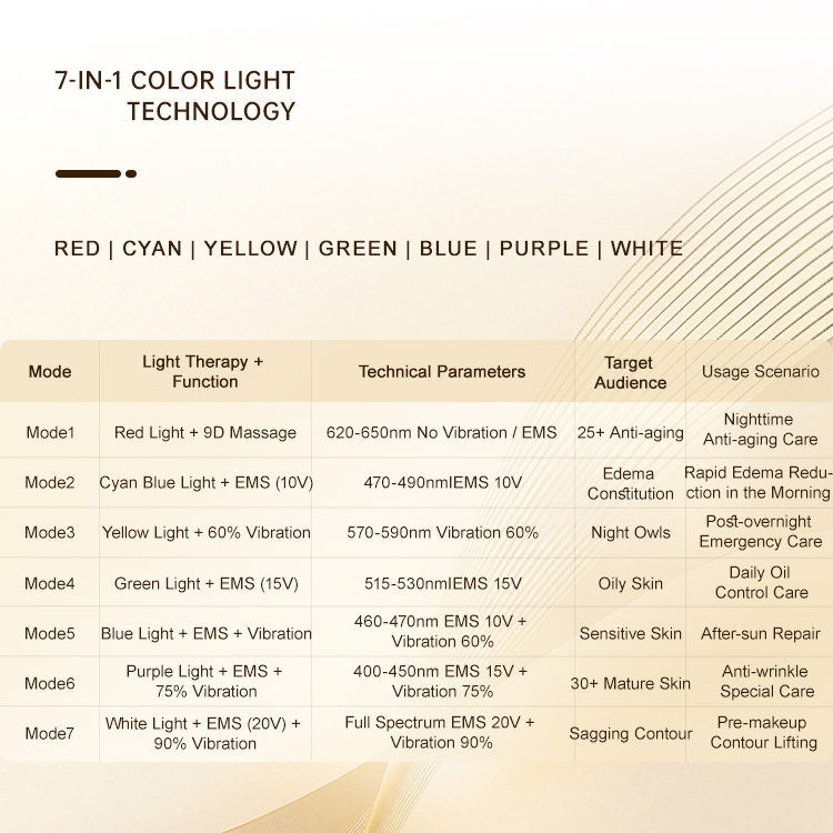 | Mode 7 | white light+EMS 20V+90% vibration | FULL spectrum EMS 20V 90% vibration | sagging contour | pre-,makeup contour lifting |