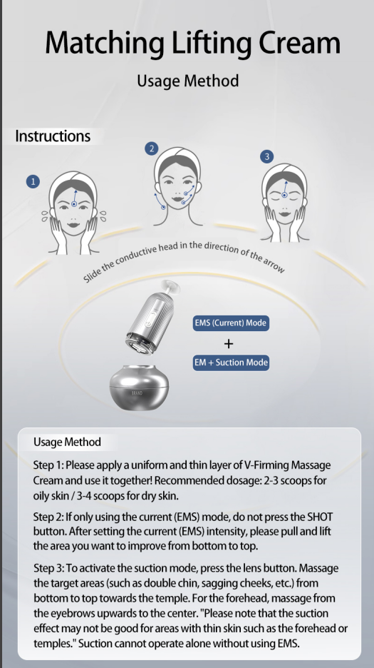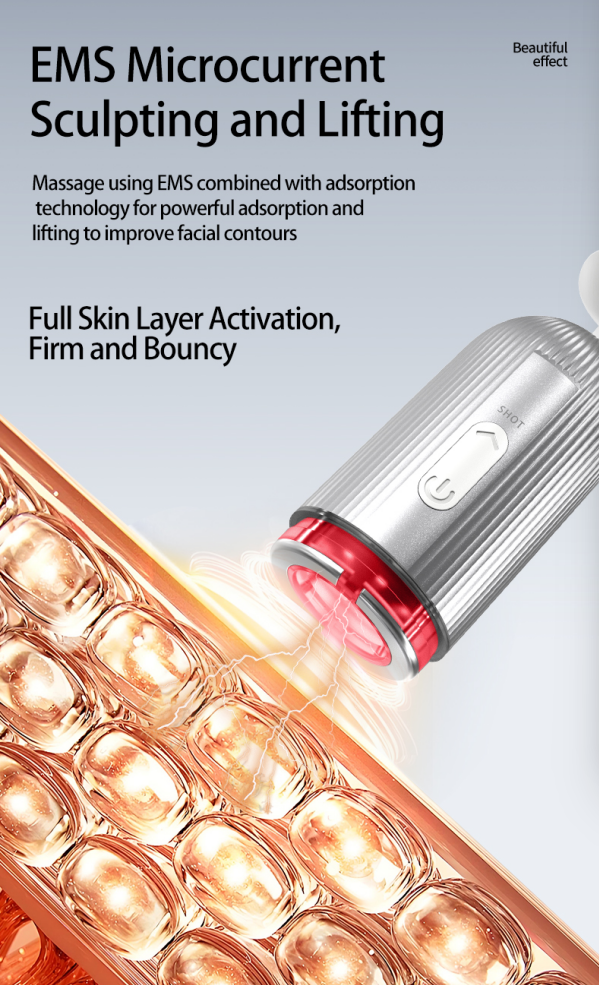 - EMS microcurrent shaping – using EMS combined with adsorption technology for massage, effectively adsorbing and lifting, improving facial contours; (Lifting drooping cheeks, double chin, weak mouth area, nasolabial folds)