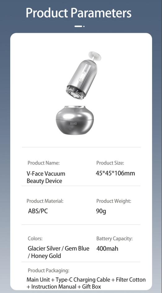 - Negative pressure exercise – low stimulation design, using adsorption technology to soften fat and improve sagging fat; Say goodbye to the ‘bag face’. Vacuum negative pressure separates subcutaneous fat, compacts fat circumference, promotes circulation and exercise;